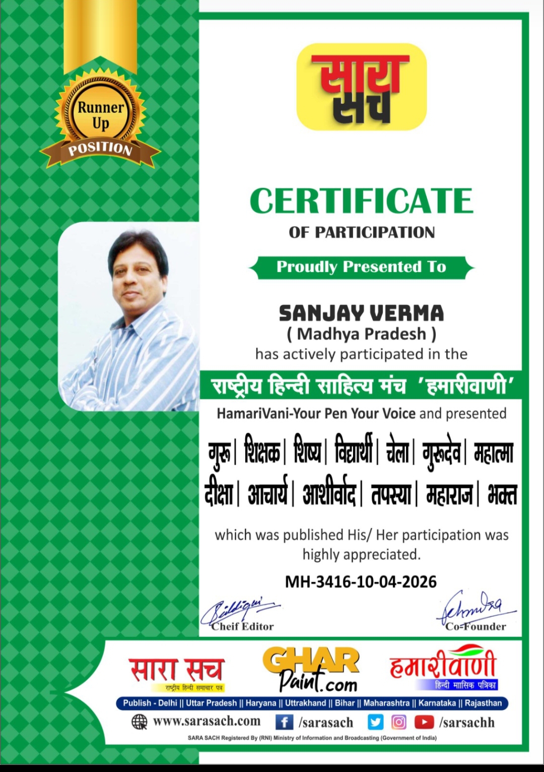 राष्ट्रीय हिन्दी मीडिया मंच "सारा सच" प्रतिवर्ष देश और प्रदेश की विशिष्ठ प्रतिभाओं को राष्ट्रीय प्रतिभा उपलब्धि अवॉर्ड 2021 से सम्मानित करता आरहा है|नई दिल्ली गवर्नमेंट ऑफ़ इंडिया सोशल मीडिया पर सर्वे अनुसार चीफ एडिटर सारा सच (राष्ट्रीय हिंदी समाचार पत्र ),दिल्ली वार्ता(राष्ट्रीय हिंदी मासिक पत्रिका ), को फाउंडर हिंदी वाणी(हिंदी मासिक पत्रिका ) की और से चीफ ऐडमिरर इन चीफ सलीम अहमद सिद्दकी के द्धारा आयोजित प्रतियोगिता में मनावर जिला धार मप्र के संजय वर्मा"दृष्टि" को राष्ट्रीय हिंदी साहित्य की और से योर पेन योर वॉइस साहित्य लेखन क्षेत्र में प्रदत्त विषय"- त्यौहार "पर उत्कृष्ट लेखन के लिए देश में छटा स्थान प्राप्त किया है |मंच ने सम्मान से विभूषित कर उज्ज्वल भविष्य की कामना करता है ।संजय वर्मा"दृष्टि" की देश विदेश की पत्र पत्रिकाओं में रचना प्रकाशित होती है।अबतक 1000 सम्मान से सम्मानित किया जा चुका है।इनका नाम वर्ल्ड बुक ऑफ़ रिकार्ड में तीन बार अलग -अलग विधा में दर्ज है|स्टार बुक ऑफ रिकार्ड,गोल्डन बुक ऑफ रिकार्ड में भी दर्ज है।