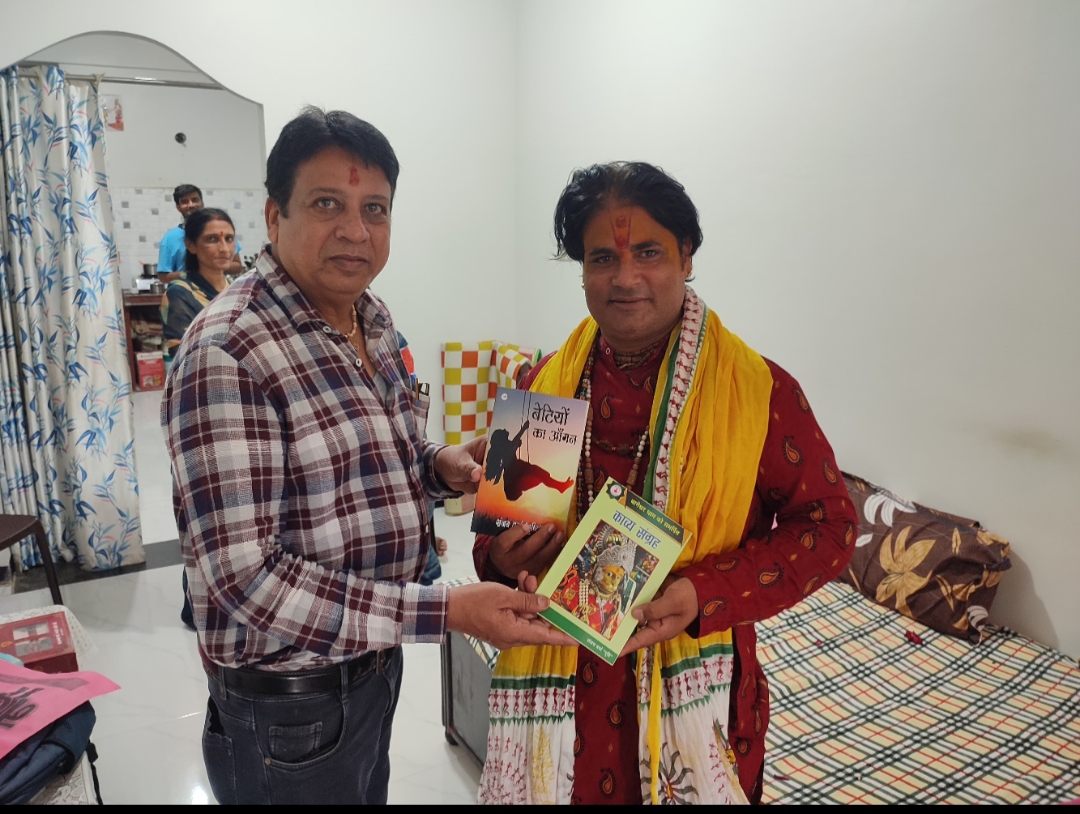 वृंदावन के भागवताचार्य पंडित महेश कृष्ण उपाध्याय जी प्रसिद्ध कथावाचक द्वारा संजय वर्मा 'दृष्टि ' के काव्य संग्रह का विमोचन
